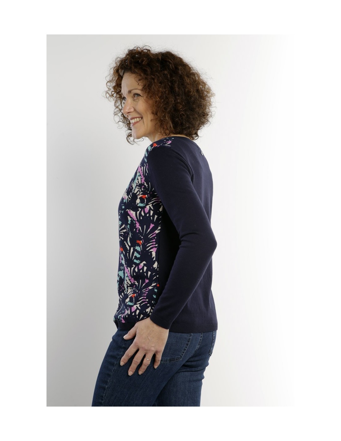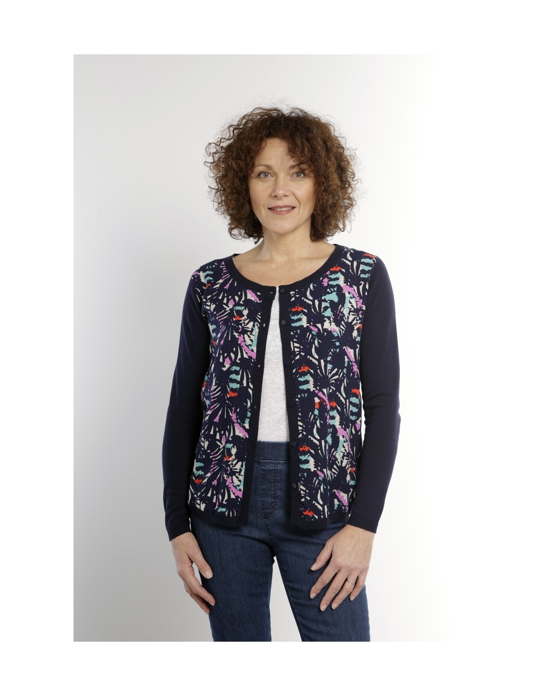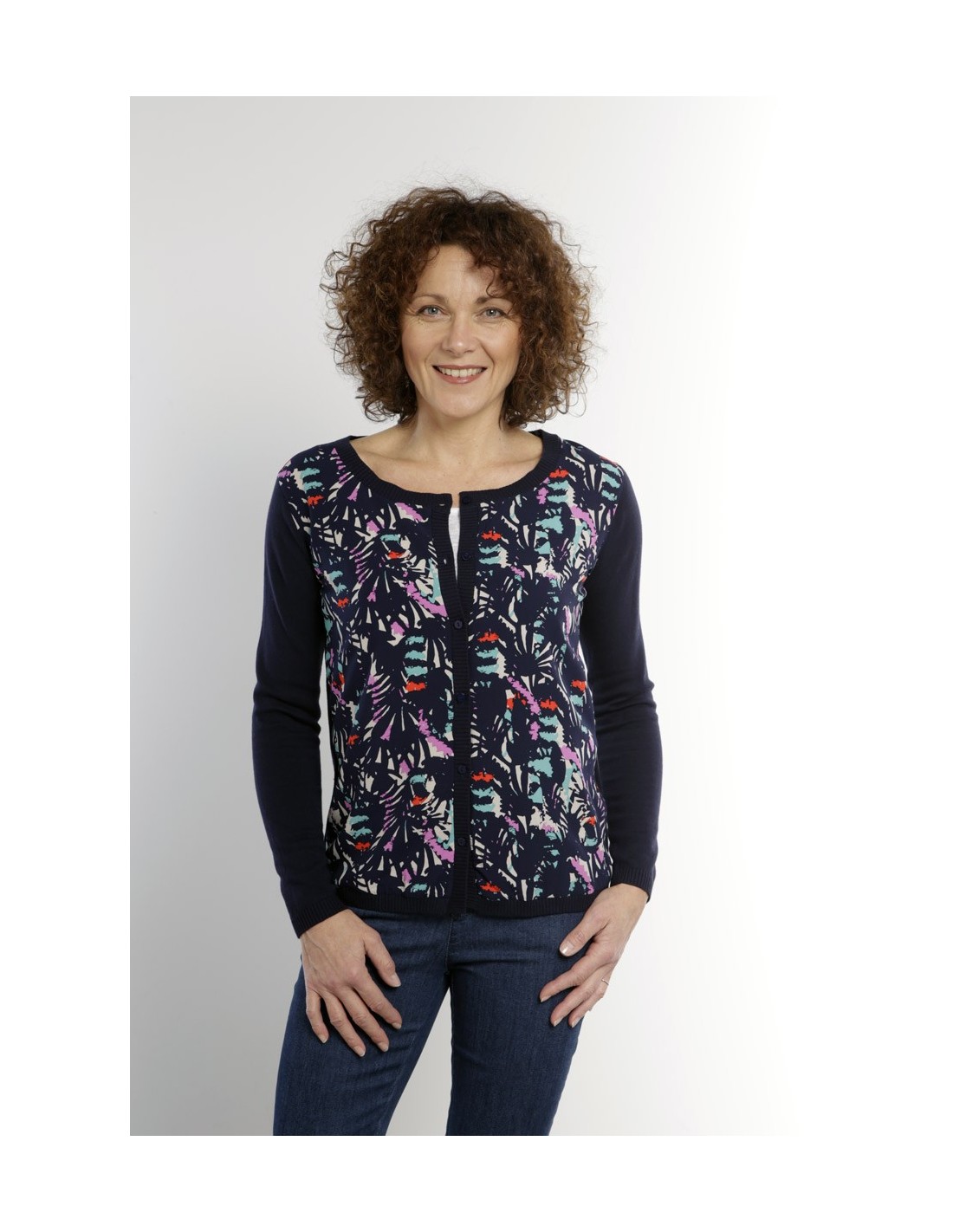 Cardigan NEVINE. Manches longues. Devant imprimé. Dos uni.