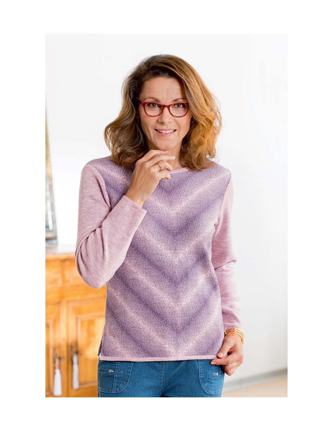 Un joli pull de couleur parme au motif jacquard effet géométrique, fendu sur les côtés pour donner plus d'aisance.