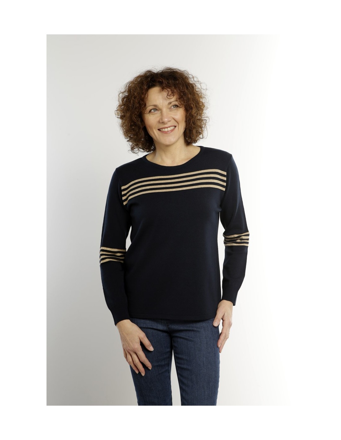 L'esprit marinière, chic ! Ce pull bleu marine arbore de jolies rayures dorées sur le devant et les manches.