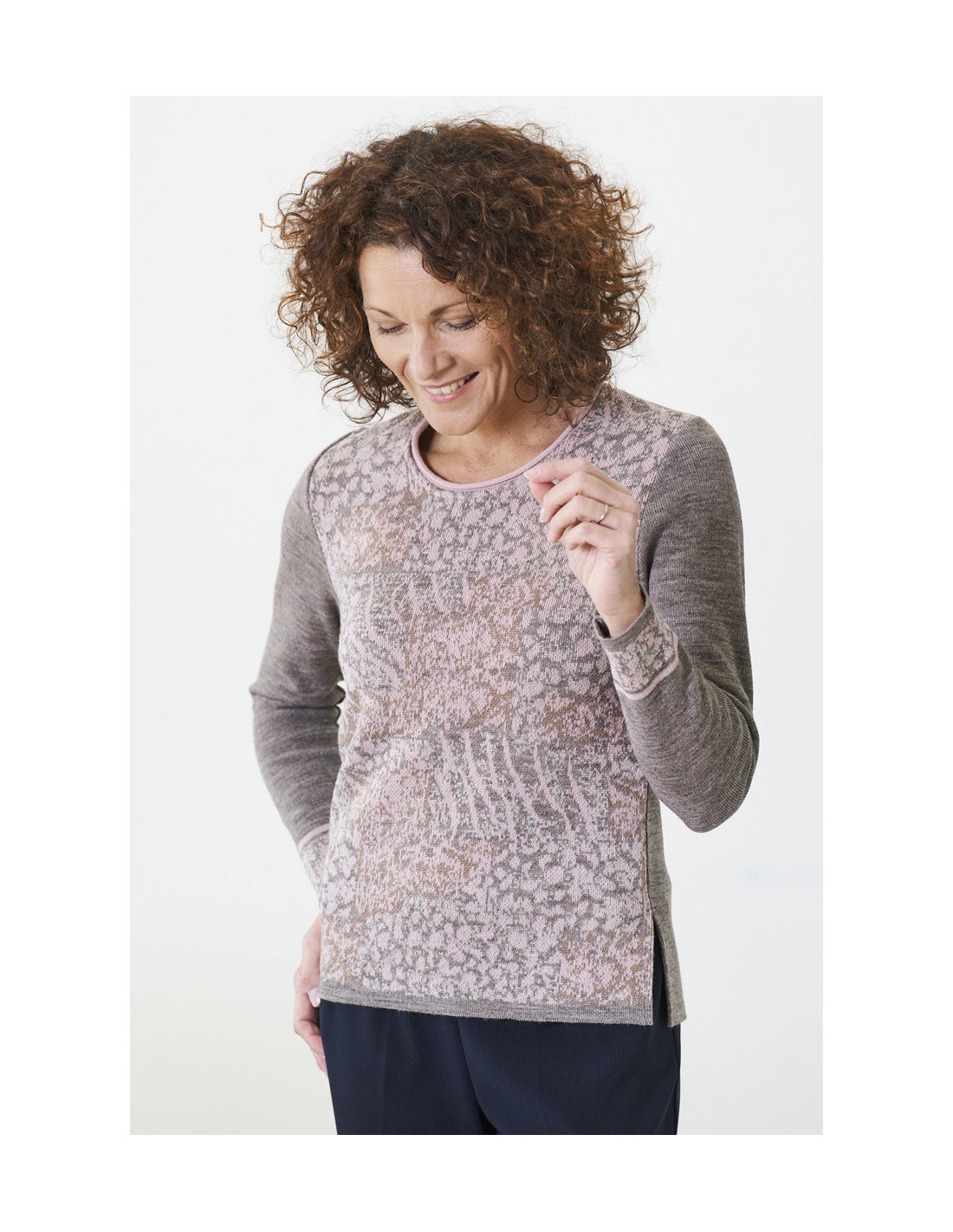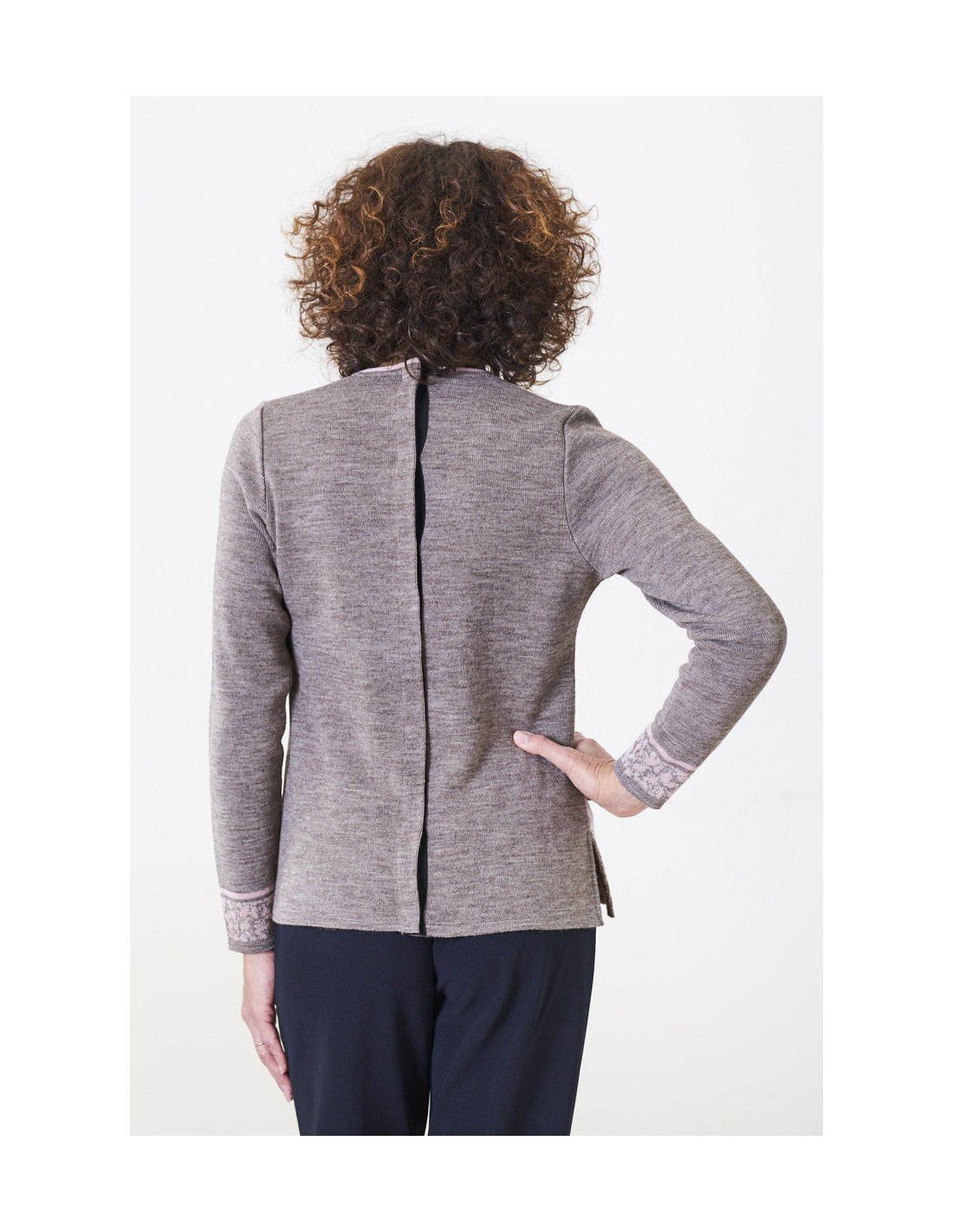 Un pull manches longues imprimé jacquard, ouvert dans le dos par boutons pressions pour plus de facilité à enfiler ou à enlever. 100% polyester. Fentes côtés.